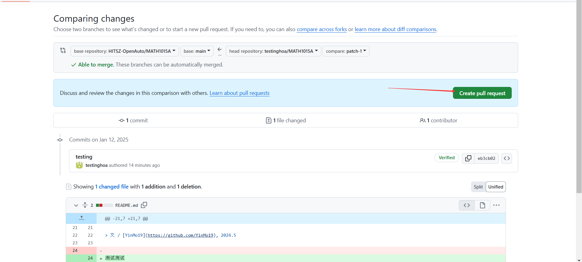 填写完成后点击 Create pull request 按钮;我们将对 Pull Request 进行审核,如有问题将指出,还请留意 GitHub 和邮箱通知。